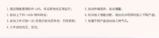 FMS柔性加工生产线特点: 1.通过管理软件LMS保证自动线运转,并与上下游进行信息交互; 2.自动上下料—AGV物料转运; 3..自动工件识别—3D视觉识别毛坯种类,引导抓取; 4..工件自动找正、定位; 5..自动传输程序、自动测量; 6.机床产能智能分配,每台机床可加工不同产品; 根据不同产品自动加工排气孔